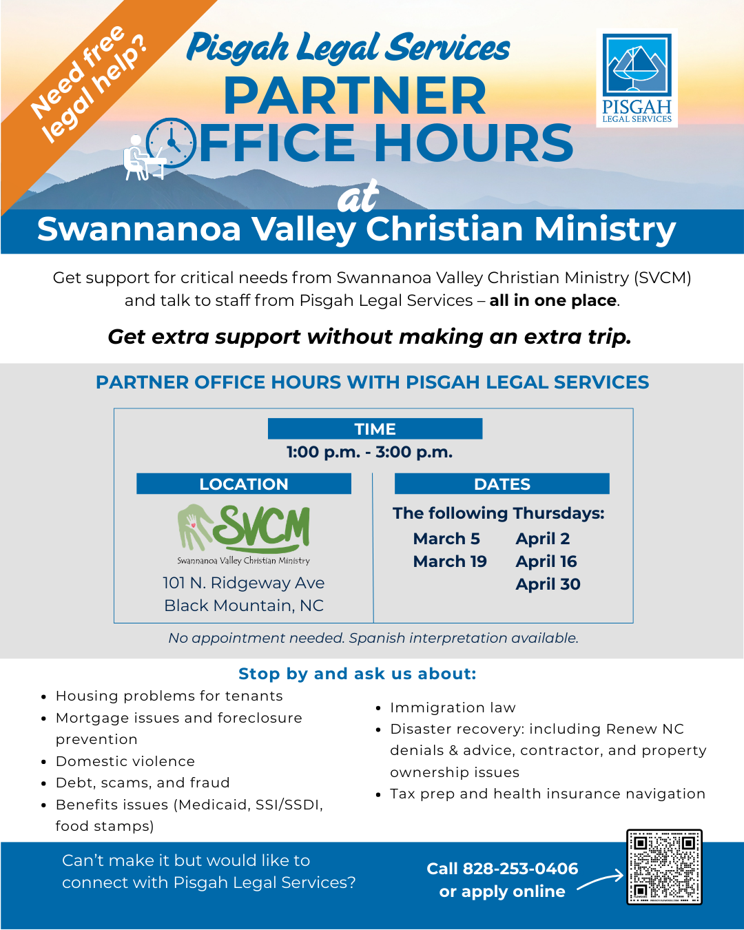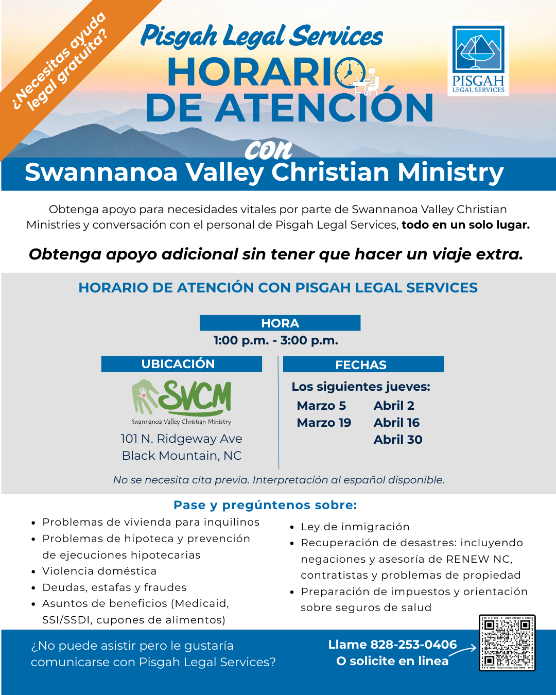 Sometimes we face challenges in life that need legal help to resolve. But getting legal advice or representation can be very expensive. That’s why this March and April, SVCM’s Crisis Ministry is teaming up with Pisgah Legal Services to offer free legal counsel to our neighbors! Every other Thursday 1 p.m. to 3 p.m., Pisgah Legal Services staff will be available at 101 N. Ridgeway in Black Mountain. No appointment necessary. Spanish interpretation is available.